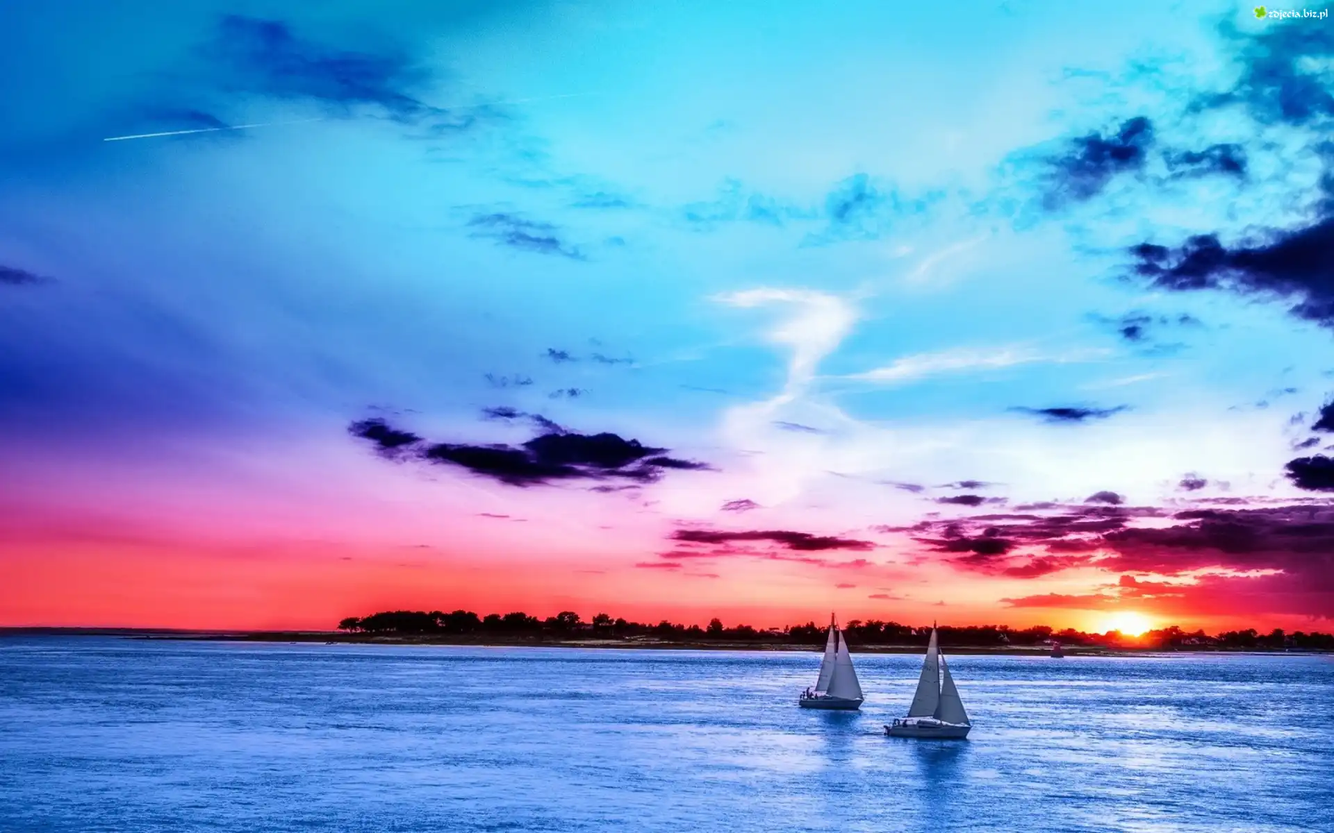 Zdjęcie Dwa, Jachty, Jezioro, Zachód, Słońca