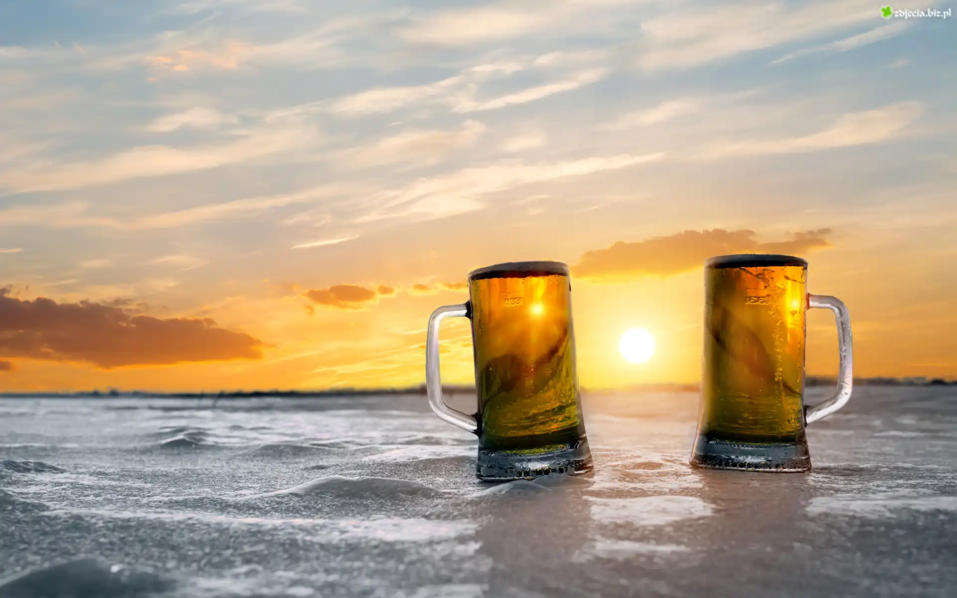 Zdjęcie Dwa, Kufle, Piwo, Zachód słońca