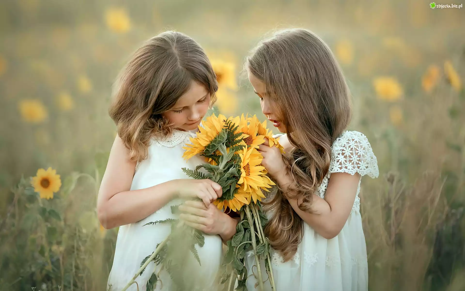 Zdjęcie Dwie, Dziewczynki, Łąka, Słoneczniki