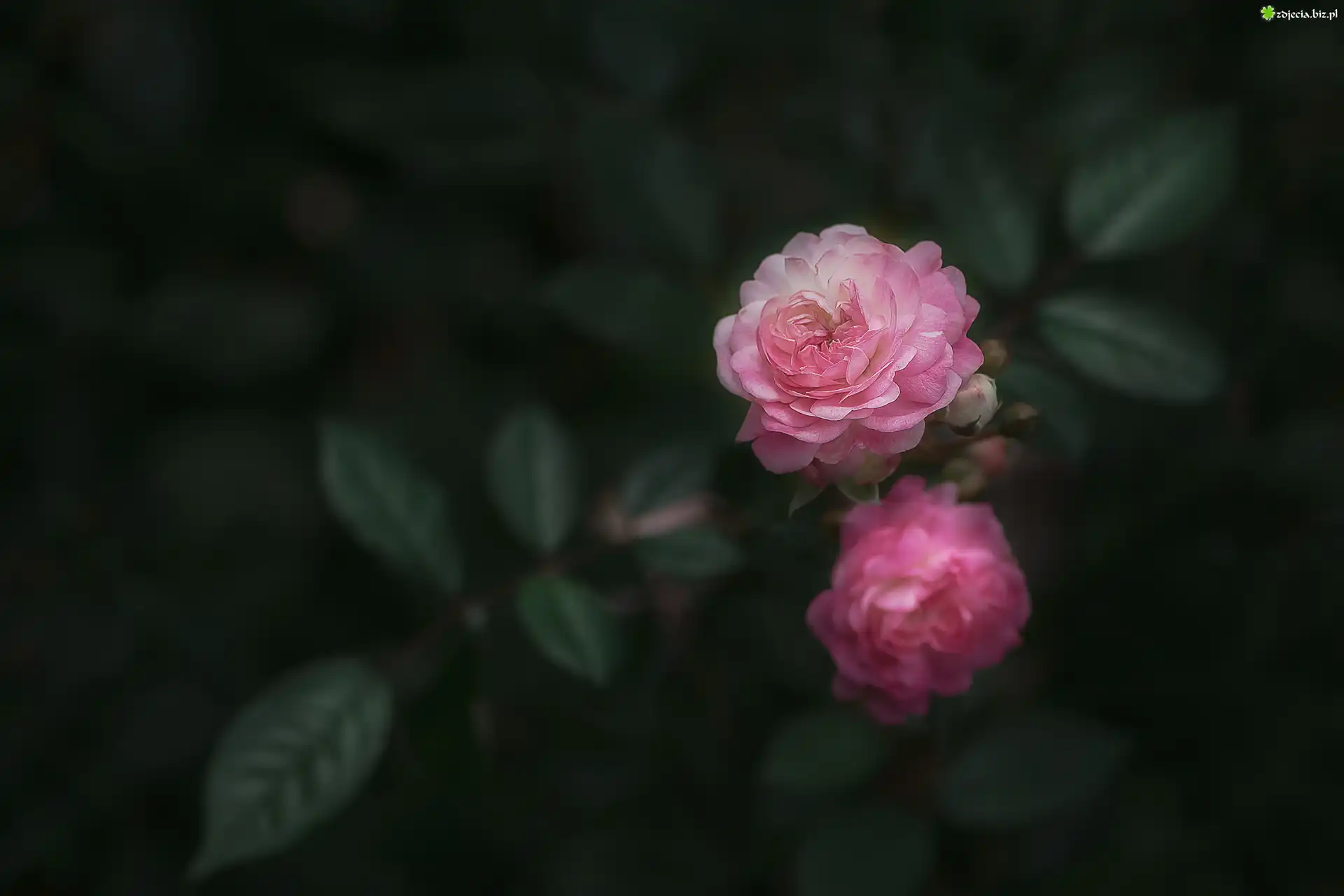 Zdjęcie, Dwie, Różowe, Róże, Liście, Ciemne tło