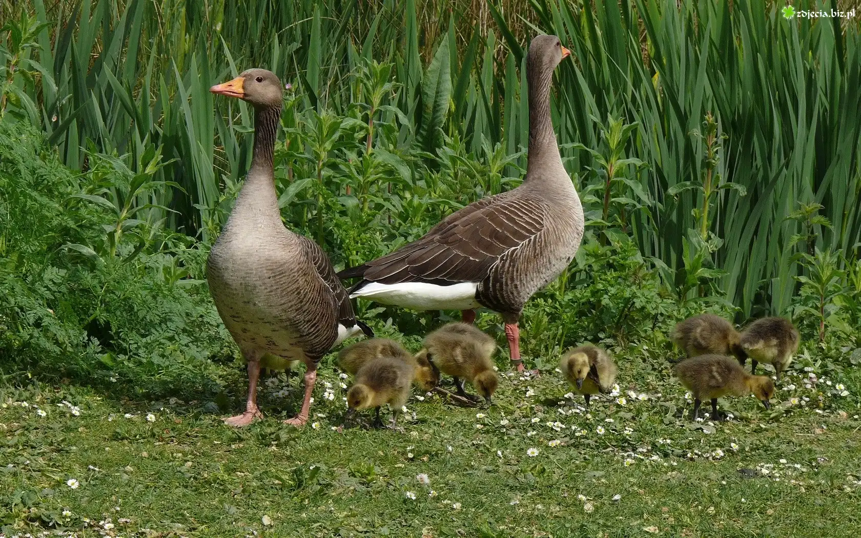 Zdjęcie Dwie, Dzikie, Gęsi, Małe, Gąsiątka