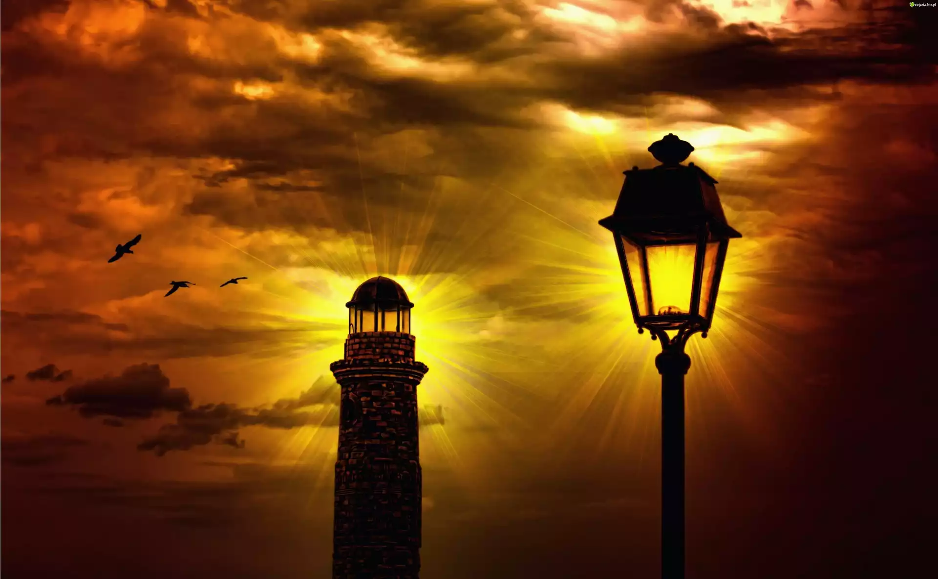Zdjęcie Dwie, Latarnie, Zachód, Słońca, Ptaki