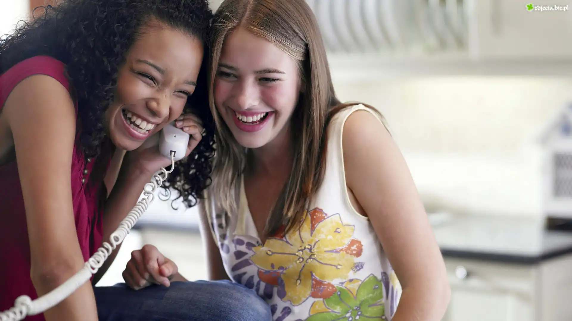 Zdjęcie, Dwie, Uśmiechnięte, Kobiety, Telefon, Rozmowa