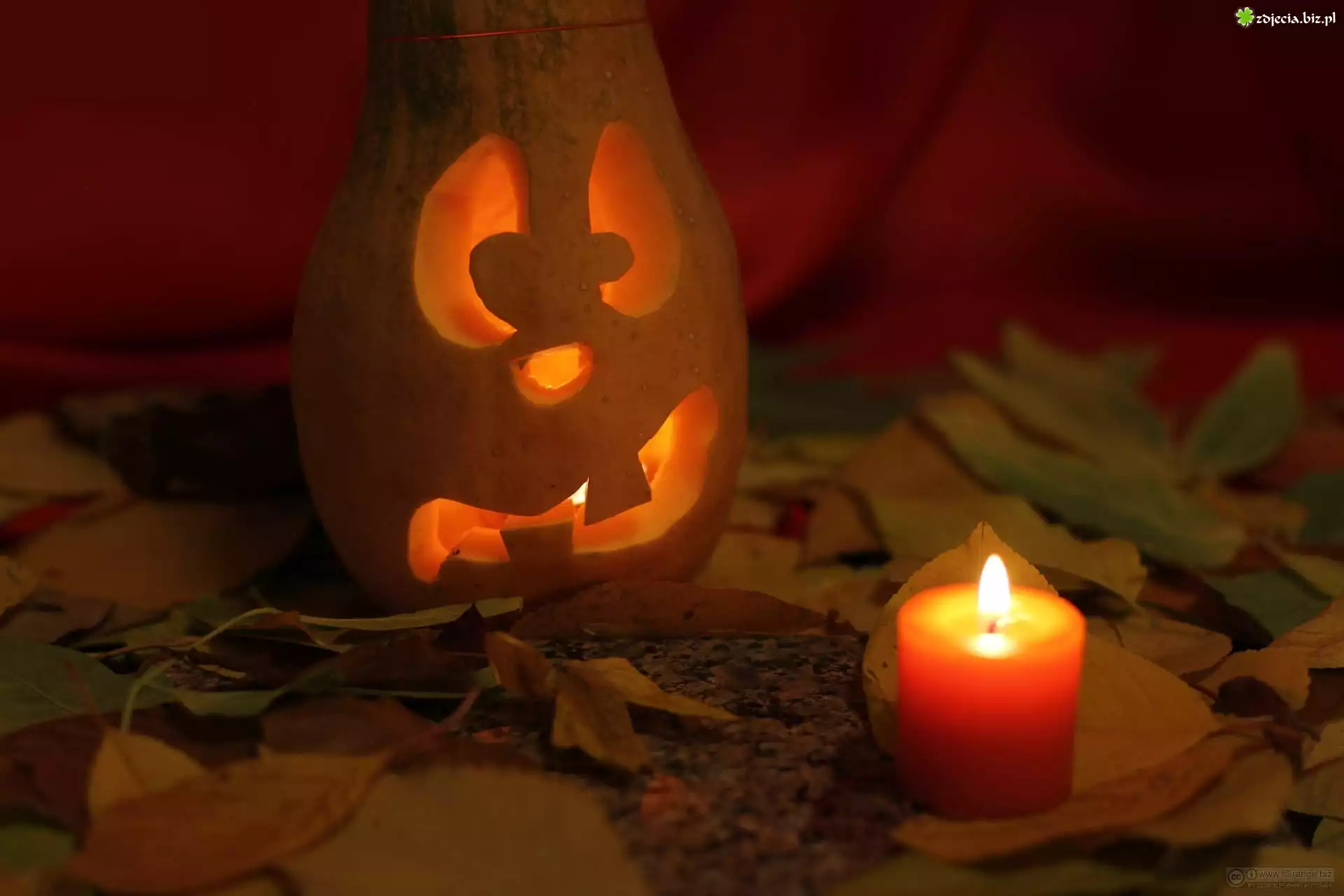 Zdjęcie Dynia, Świeczka, Liście, Jesień, Halloween