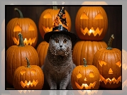 Zdjęcie Halloween, Kot, Kapelusz, Dynie, Grafika AI