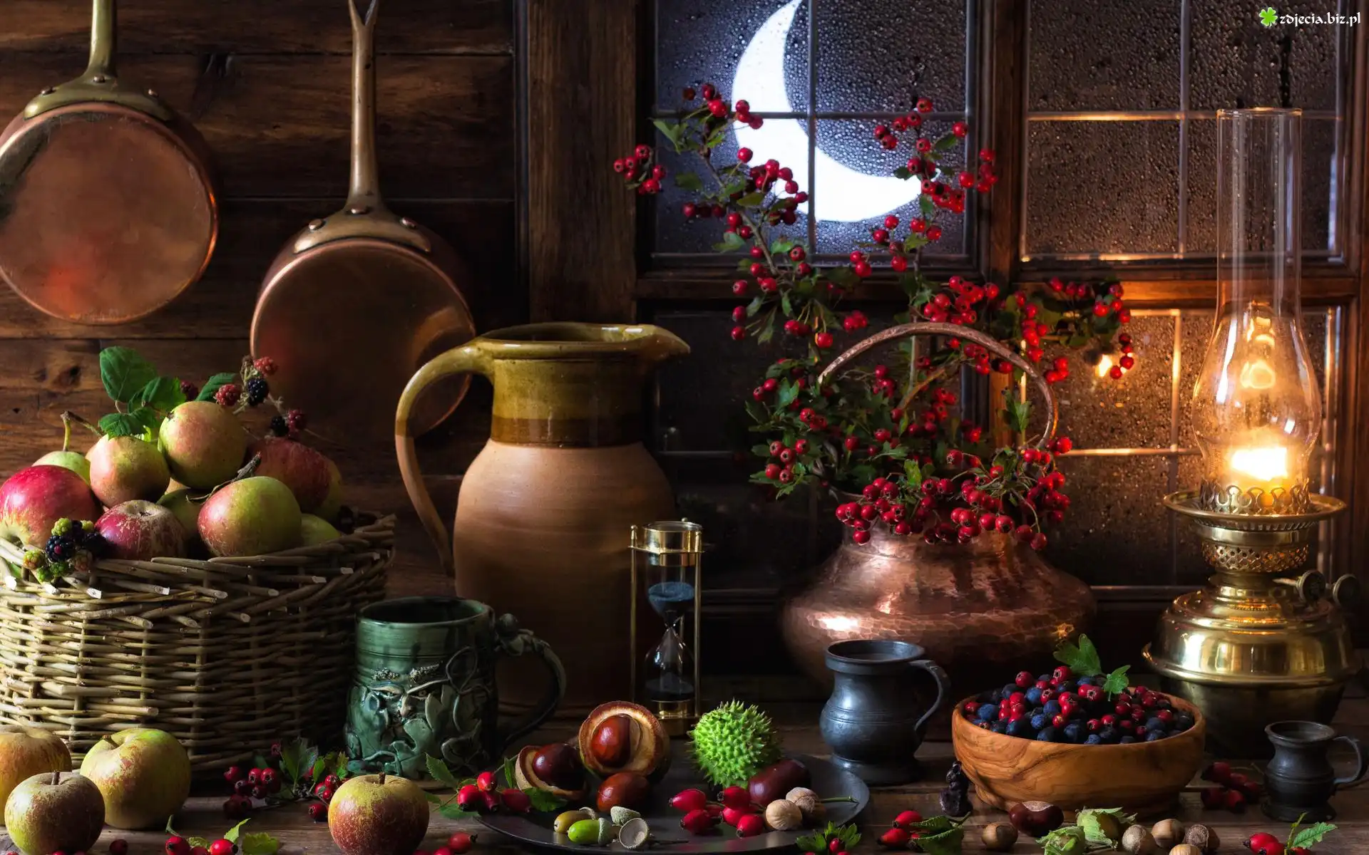 Zdjęcie Kompozycja, Dzban, Patelnie, Lampa, Naftowa, Księżyc, Okno