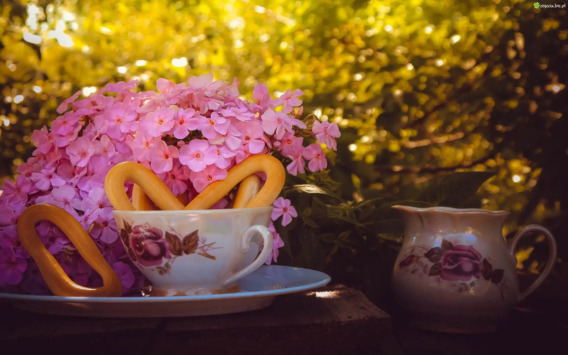 Zdjęcie Filiżanka, Dzbanek, Kwiaty, Ławka, Ogród, Drzewa, Światło