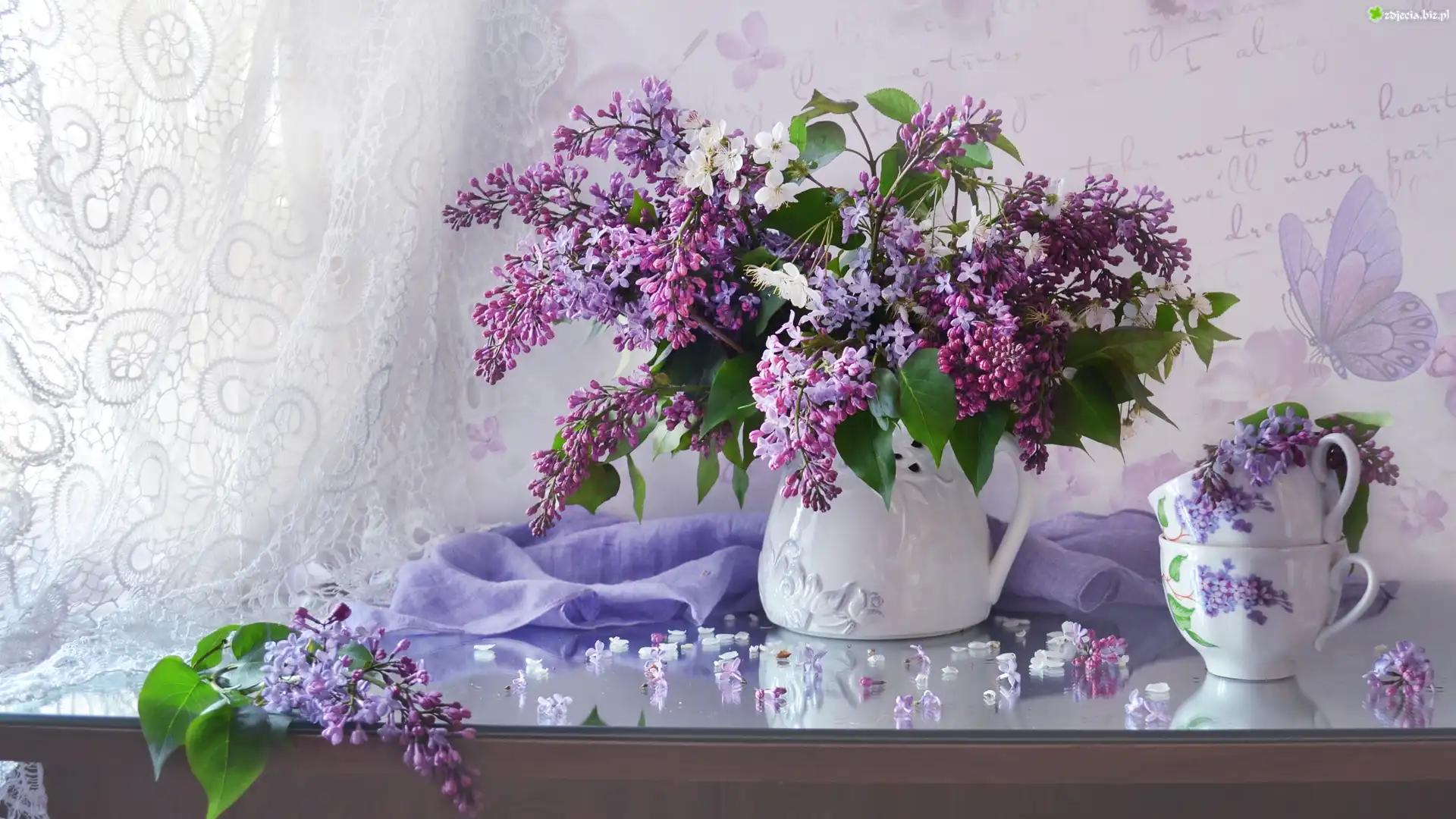Zdjęcie Kompozycja, Dzbanek, Fioletowy, Bez, Bukiet, Filiżanki, Firanka