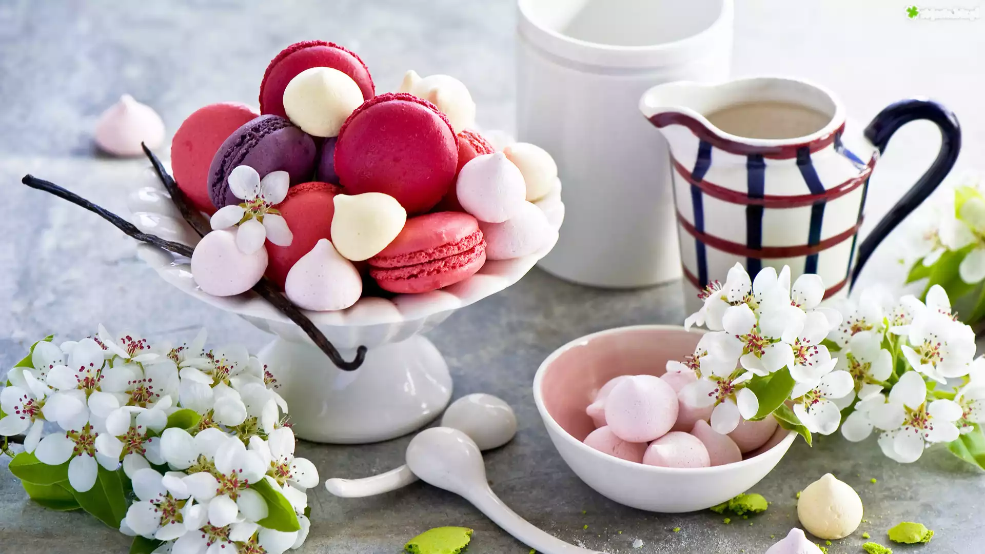 Zdjęcie Patera, Dzbanuszek, Miseczka, Makaroniki, Bezy, Kwiaty, Gałązki