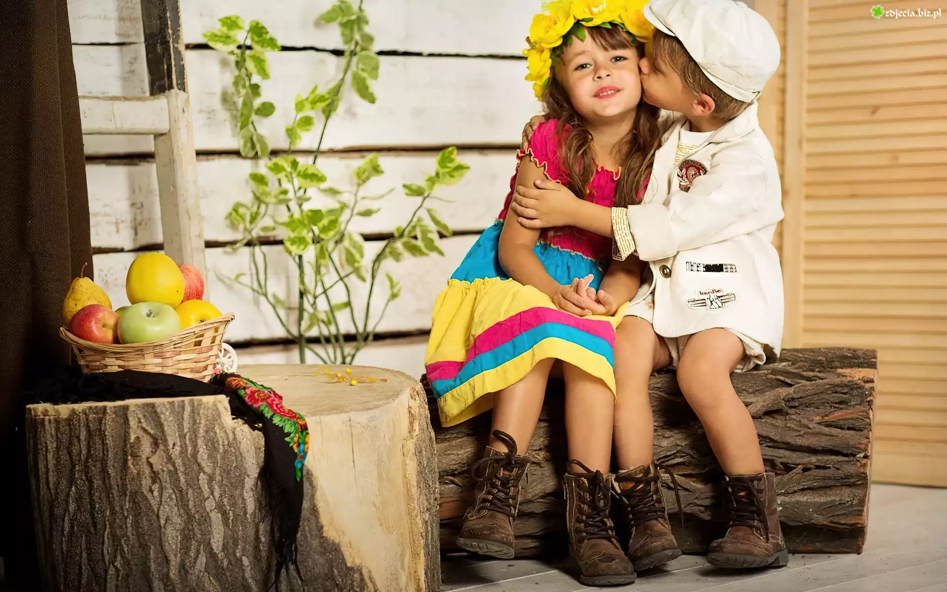 Zdjęcie Dzieci, Dziewczynka, Chłopiec, Owoce, Pocałunek, Przyjaźń