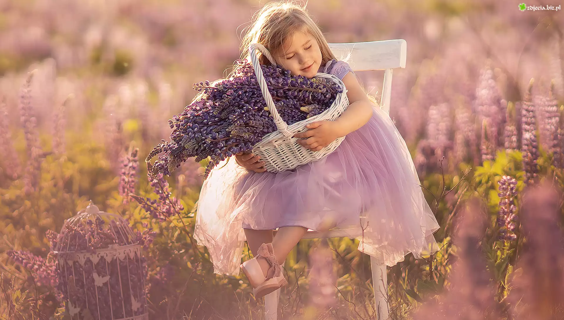 Zdjęcie Dzieci, Dziewczynka, Kwiaty, Łubin, Koszyk