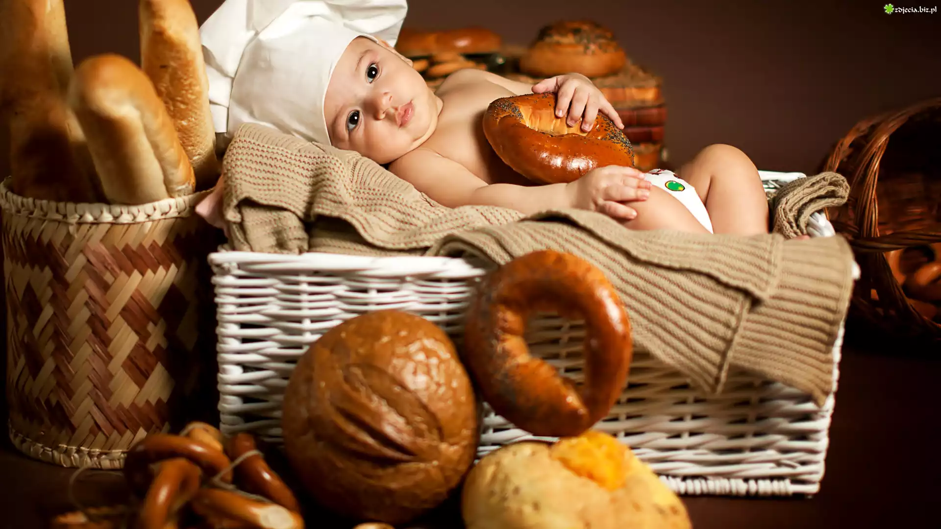 Zdjęcie Dziecko, Koszyk, Pieczywo, Czapka, Kucharza