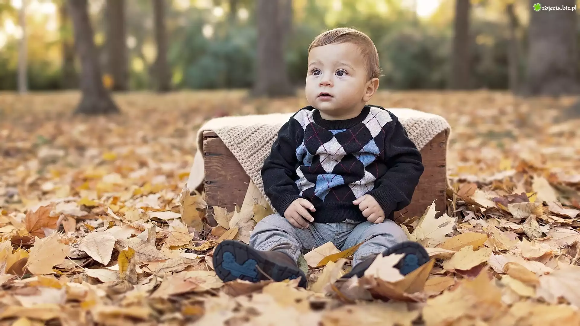 Zdjęcie Dziecko, Chłopczyk, Zapatrzony, Liście, Drewniana, Skrzynia