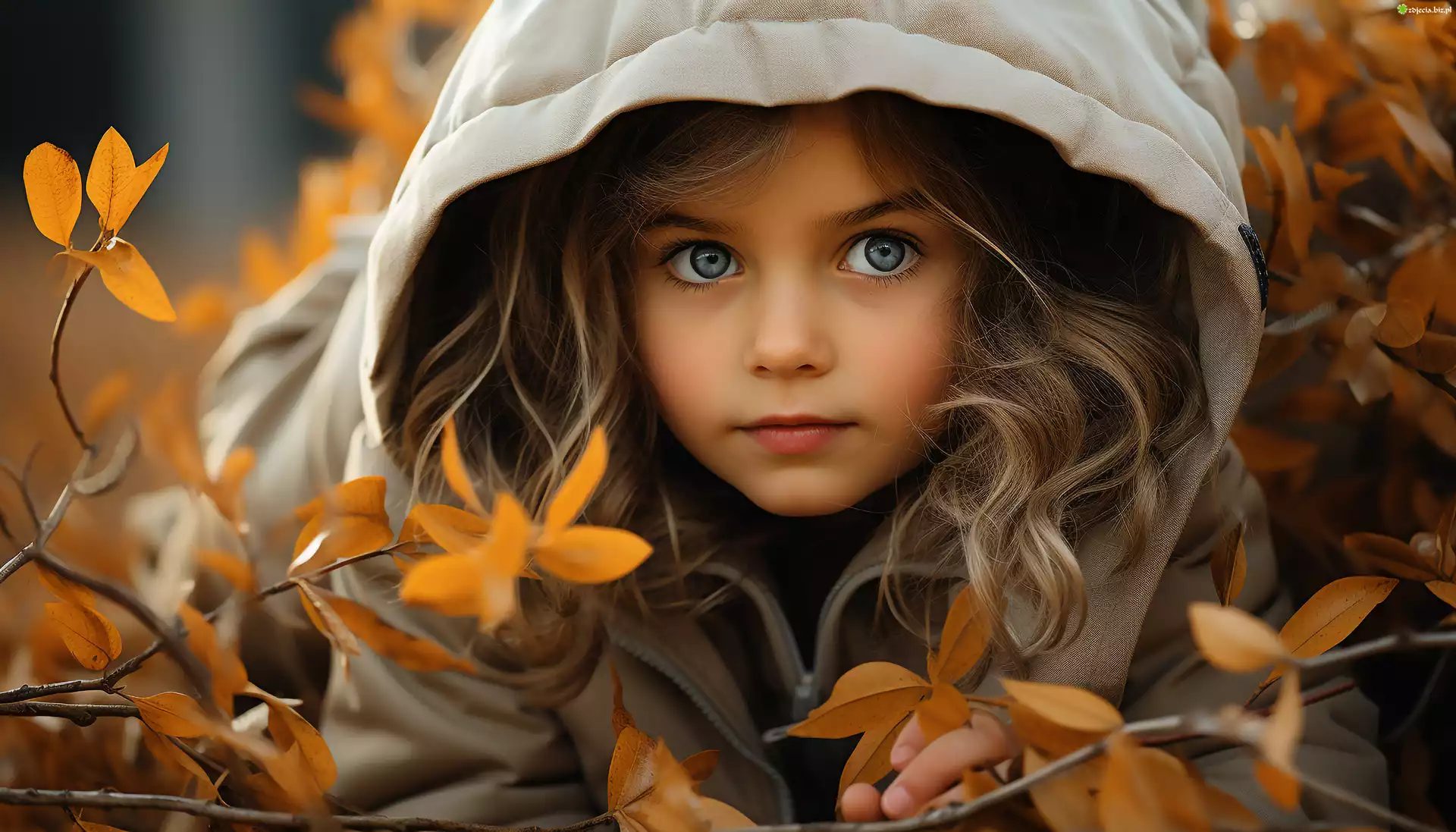 Zdjęcie Dziecko, Dziewczynka, Twarz, Długie, Kręcone, Włosy, Kaptur, Żółte, Liście