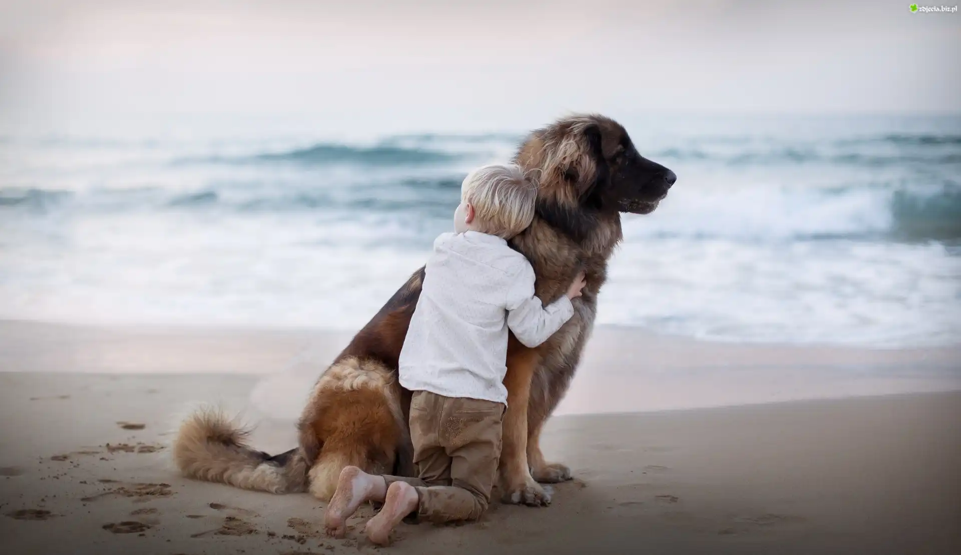 Zdjęcie Dziecko, Pies, Leonberger, Plaża, Morze, Przyjaciele