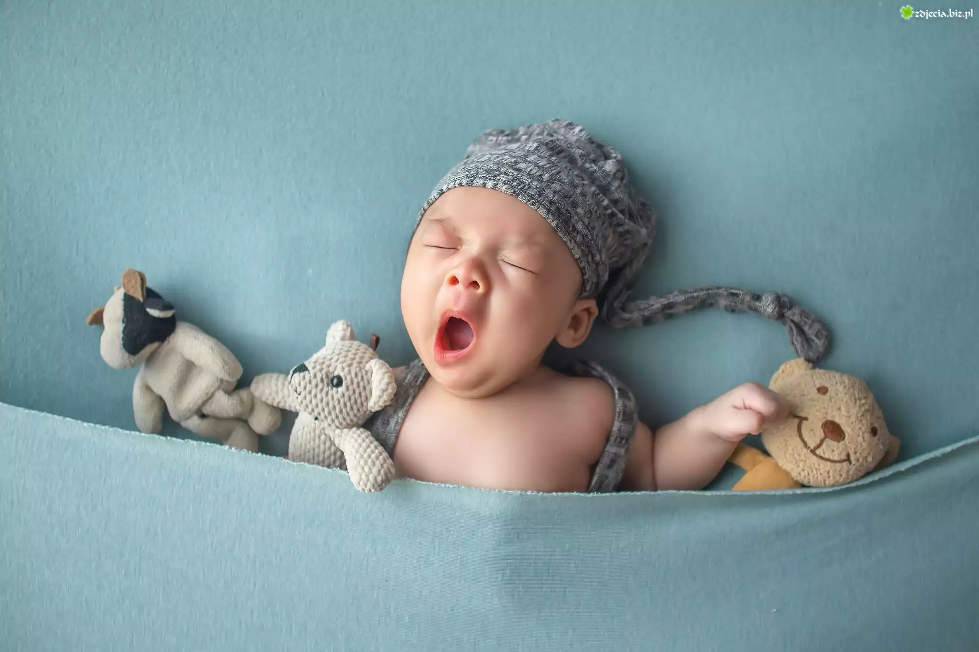 Zdjęcie Niemowlę, Dziecko, Zabawki, Ziewanie, Czapeczka