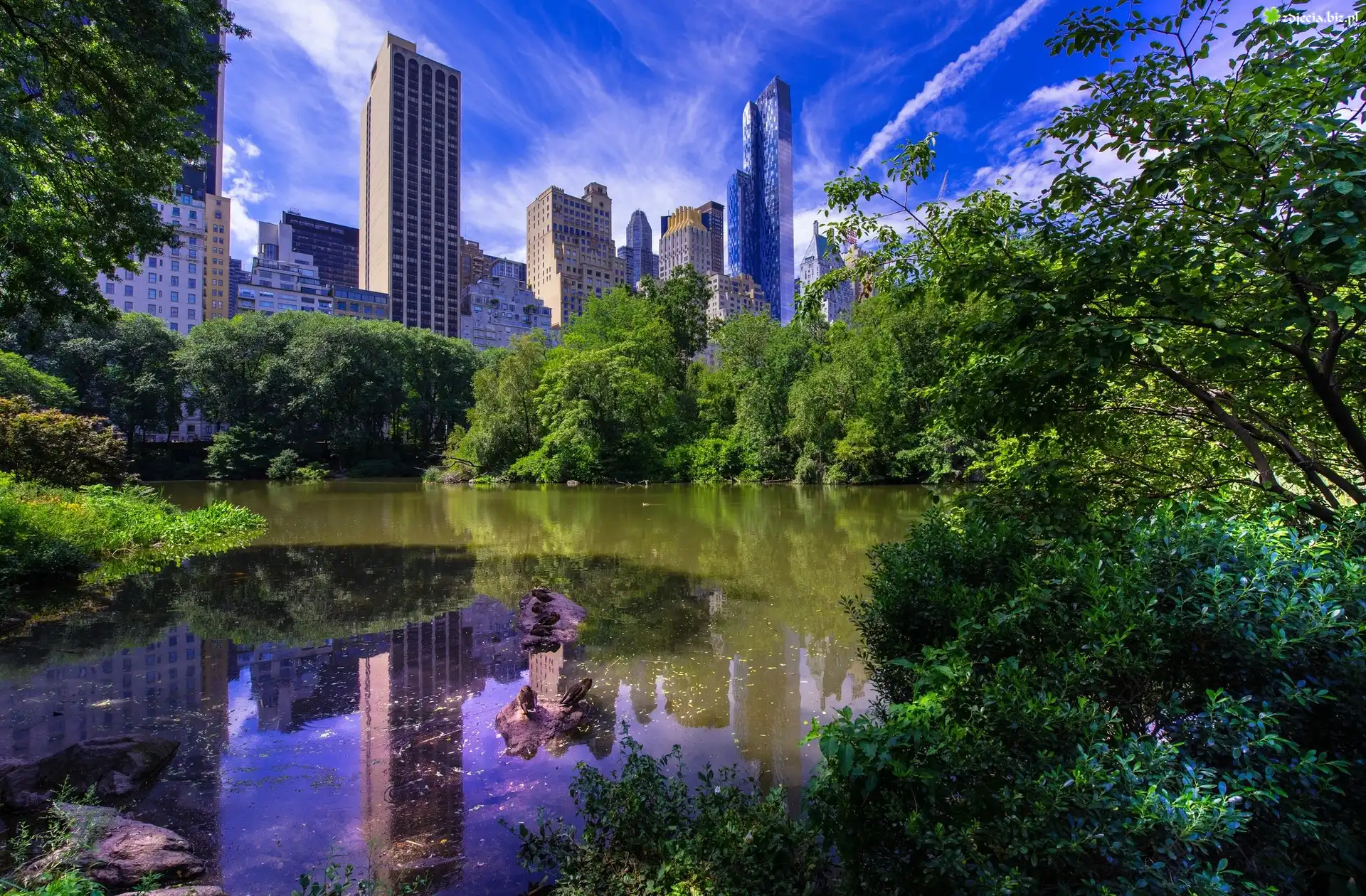 Zdjęcie Stany Zjednoczone, Nowy Jork, Dzielnica Manhattan, Park miejski Central Park, Staw, Drapacze chmur, Drzewa |