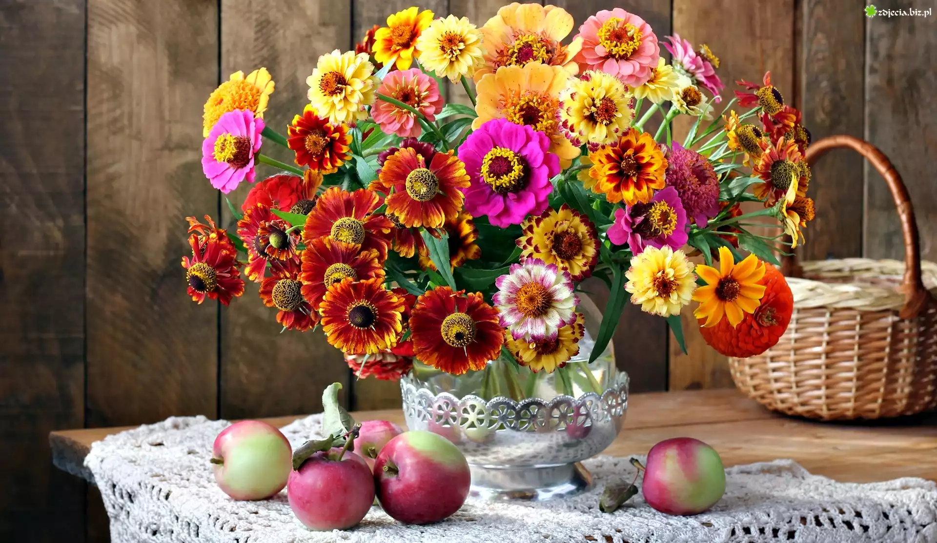 Zdjęcie Kwiaty, Dzielżany, Cynie, Bukiet, Koszyk, Jabłka, Kompozycja