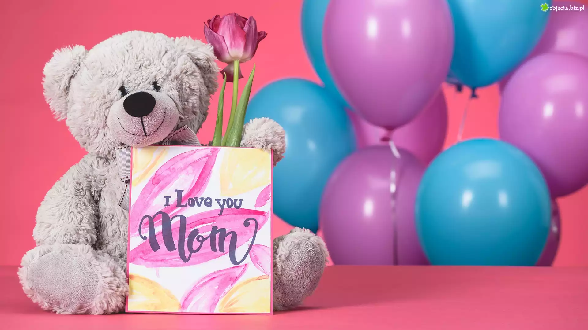 Zdjęcie Dzień Matki, Pluszak, Tulipan, Kartka, Baloniki
