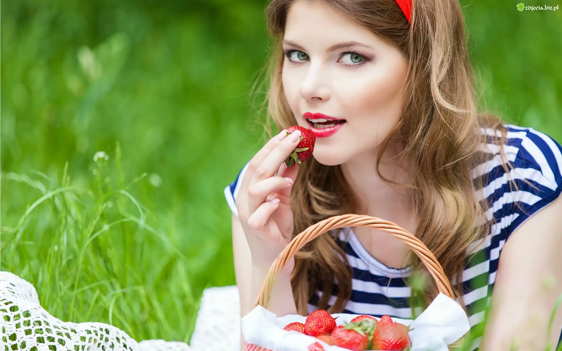 Zdjęcie Dziewczyna, Koszyk, Truskawki, Łąka, Trawa