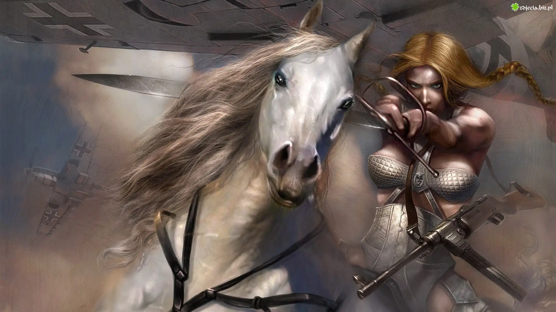 Zdjęcie Dziewczyna, Zbroja, Broń, Koń