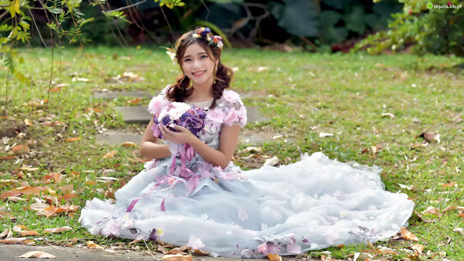 Zdjęcie Dziewczyna, Azjatka, Biała, Sukienka, Bukiet, Kwiatów