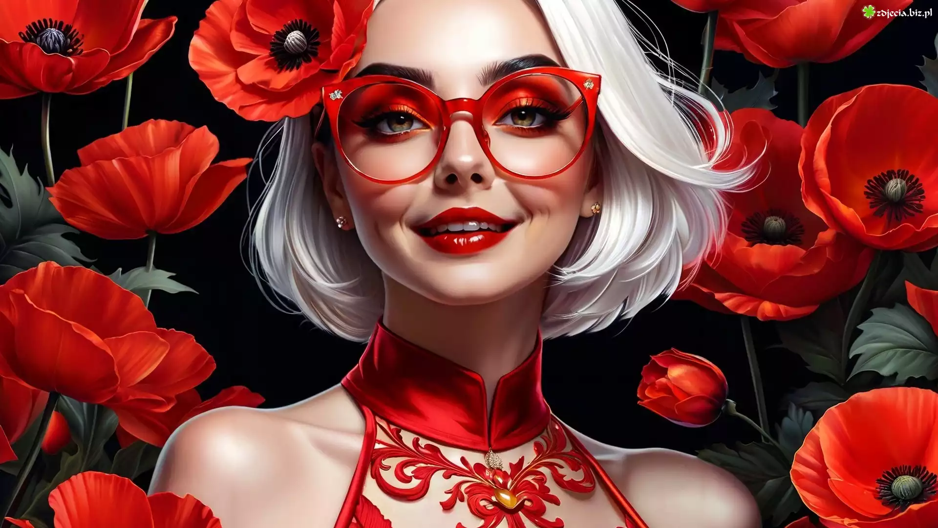 Zdjęcie Dziewczyna, Blondynka, Czerwona, Sukienka, Czerwone, Okulary, Czerwone, Maki, Grafika