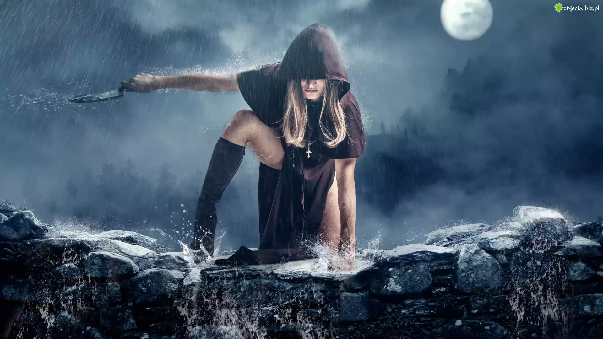 Zdjęcie Dziewczyna, Płaszcz, Nóż, Deszcz, Murek
