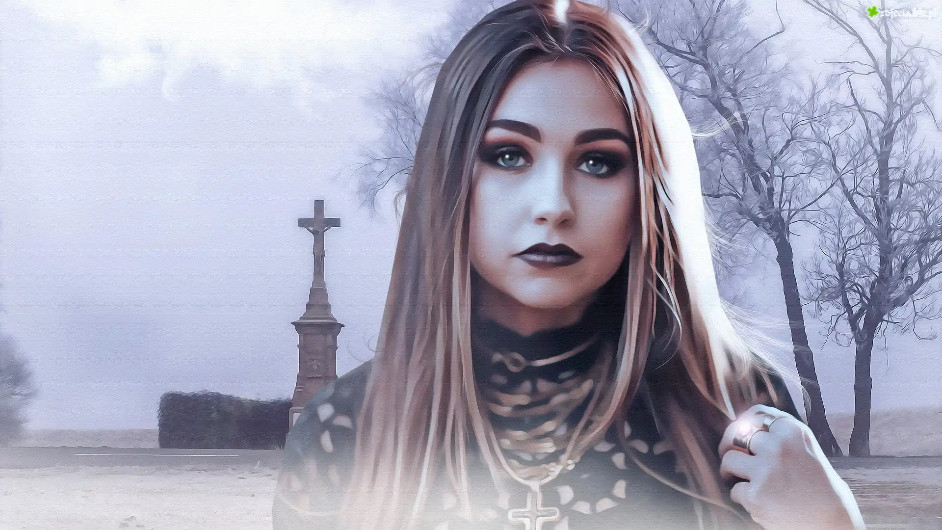 Zdjęcie Dziewczyna, Kapliczka, Drzewa, Fractalius
