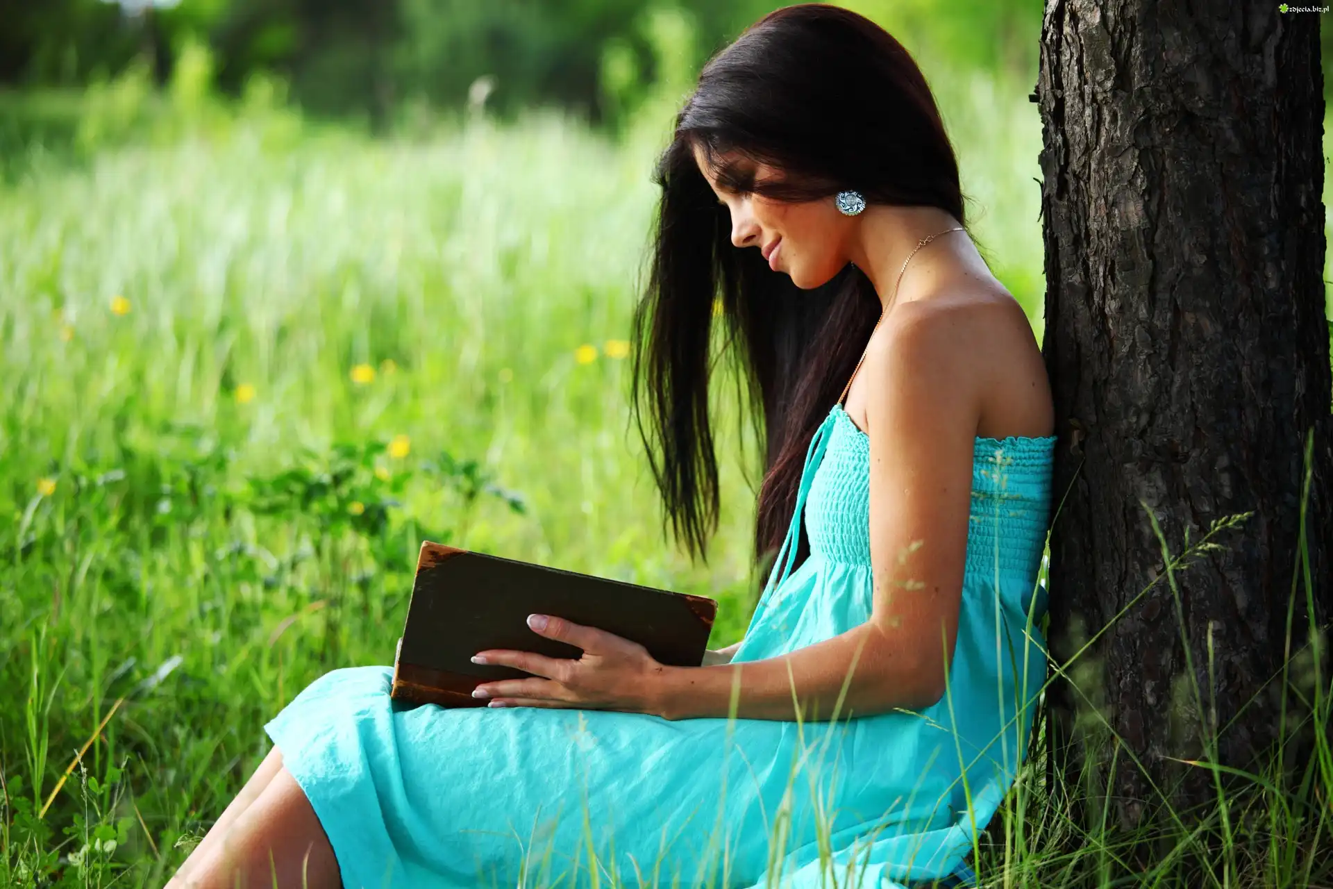 Zdjęcie Dziewczyna, Książka, Drzewo, Łąka