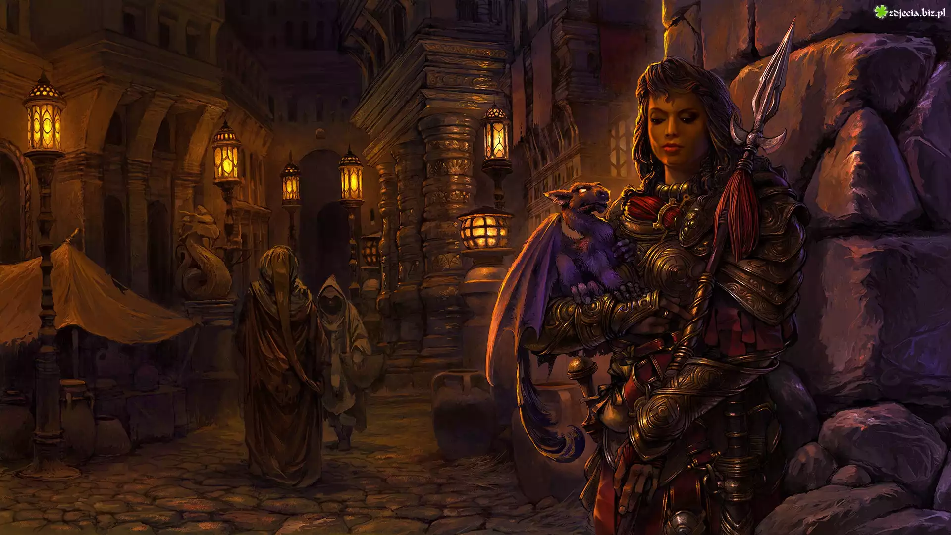 Zdjęcie Fantasy, Dziewczyna, Wojowniczka, Zbroja, Włócznia, Smok, Uliczka