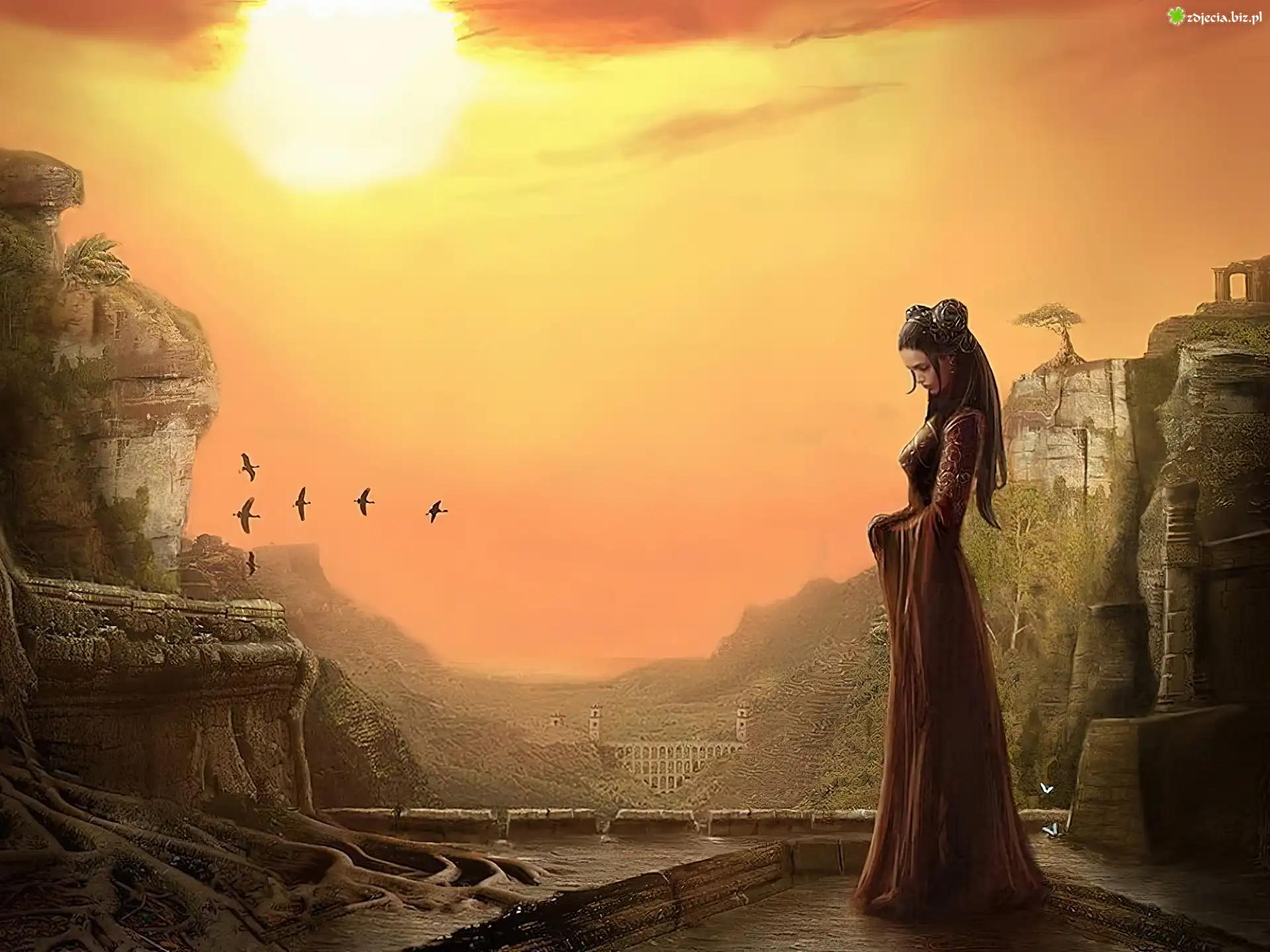 Zdjęcie Dziewczyna, Ptaki, Góry, Ruiny