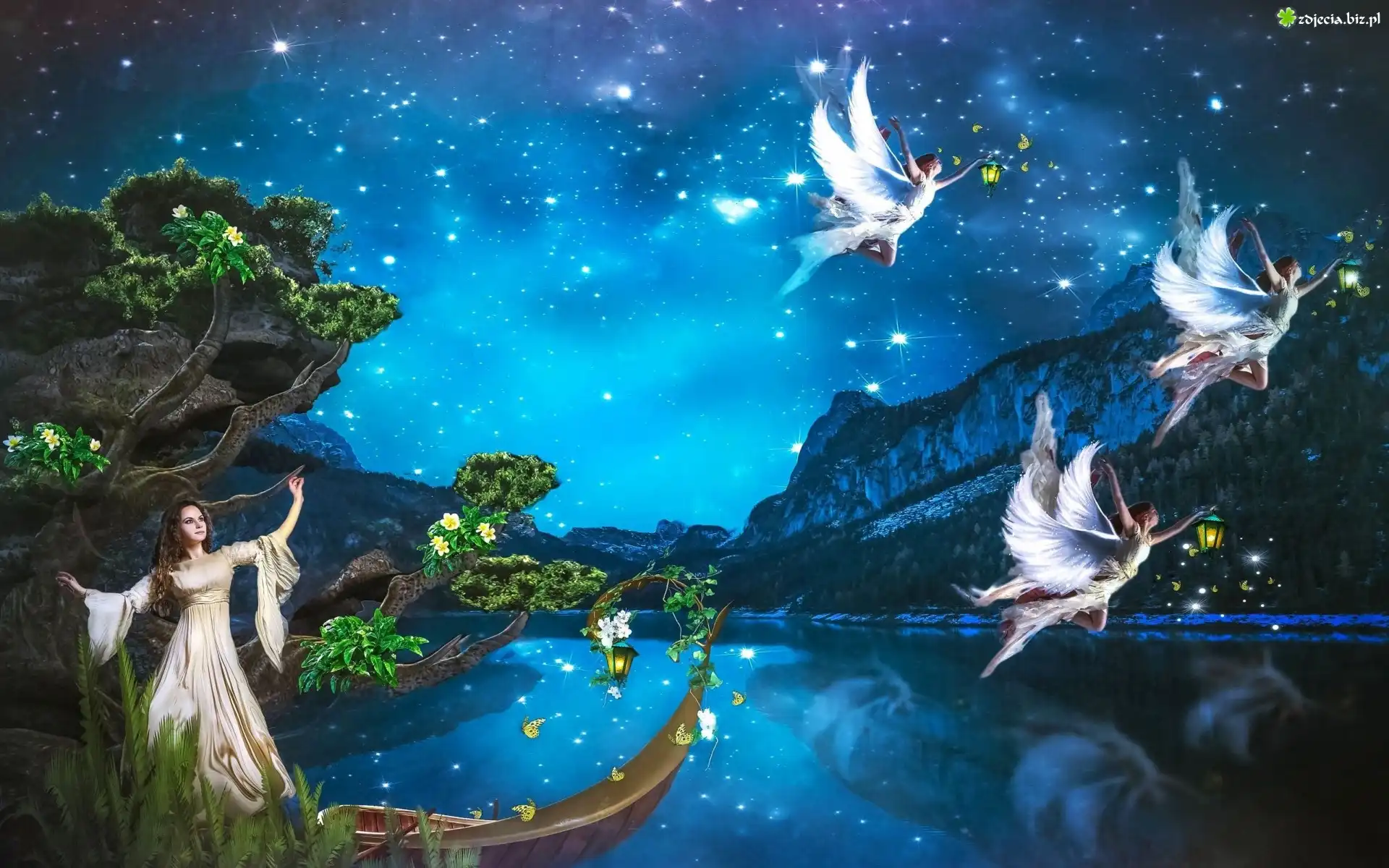 Zdjęcie Fantasy, Góry, Jezioro, Drzewa, Noc, Gwiazdy, Elfy, Aniołki, Dziewczyna
