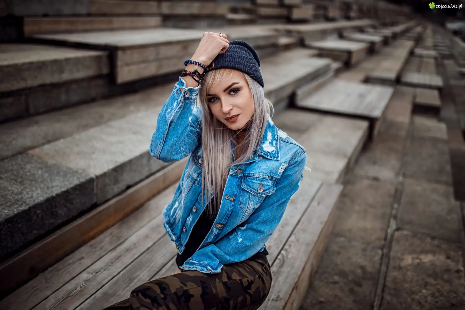 Zdjęcie Dziewczyna, Czapka, Dżinsowa, Kurtka, Ławki
