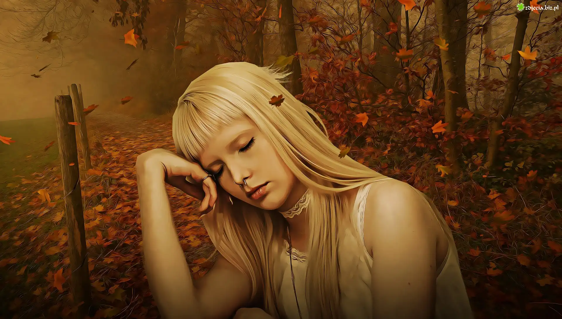 Zdjęcie Dziewczyna, Drzewa, Las, Liście, Paintography