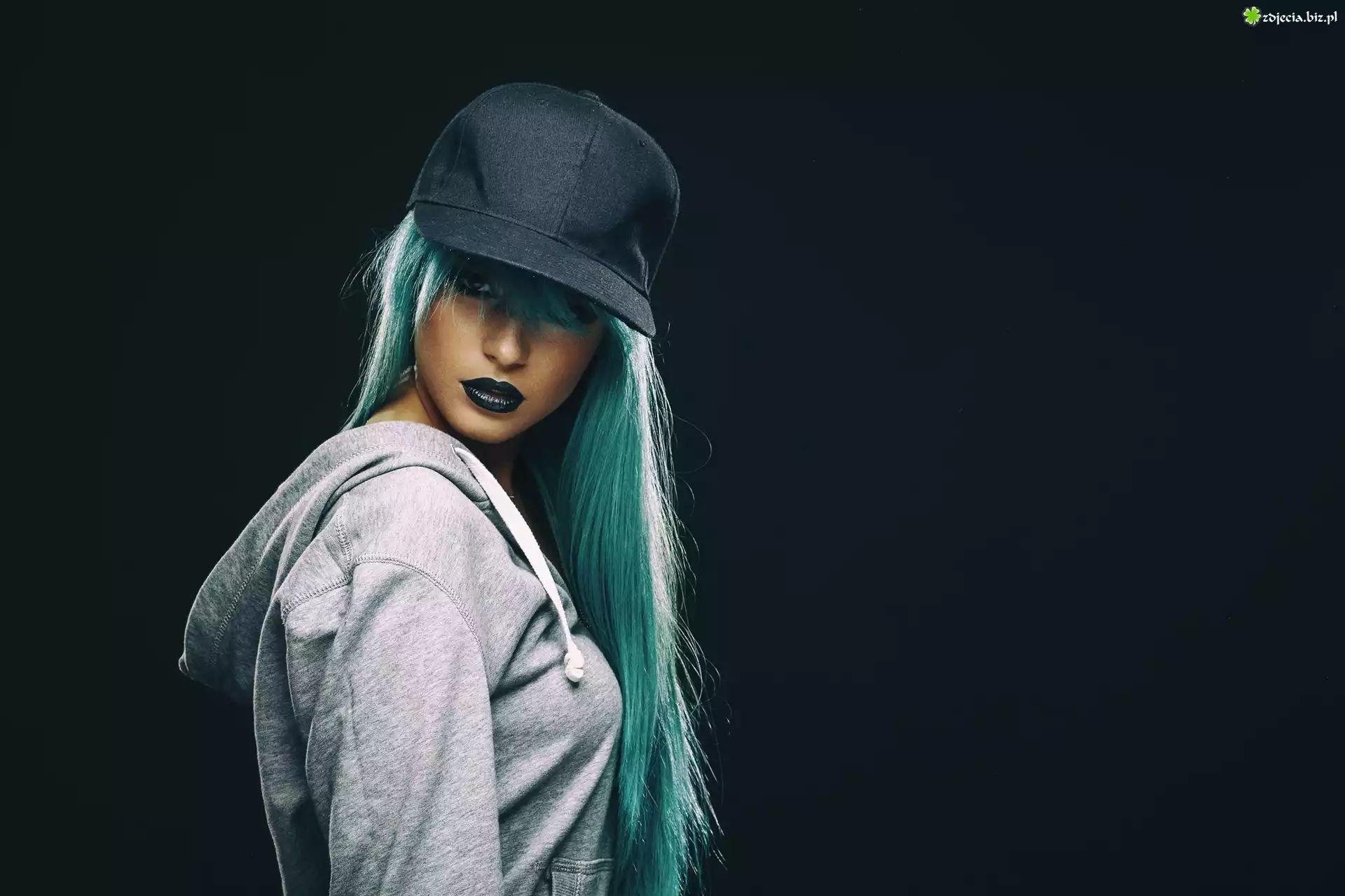 Zdjęcie Dziewczyna, Makijaż, Czapka, Bluza, Turkusowe, Włosy