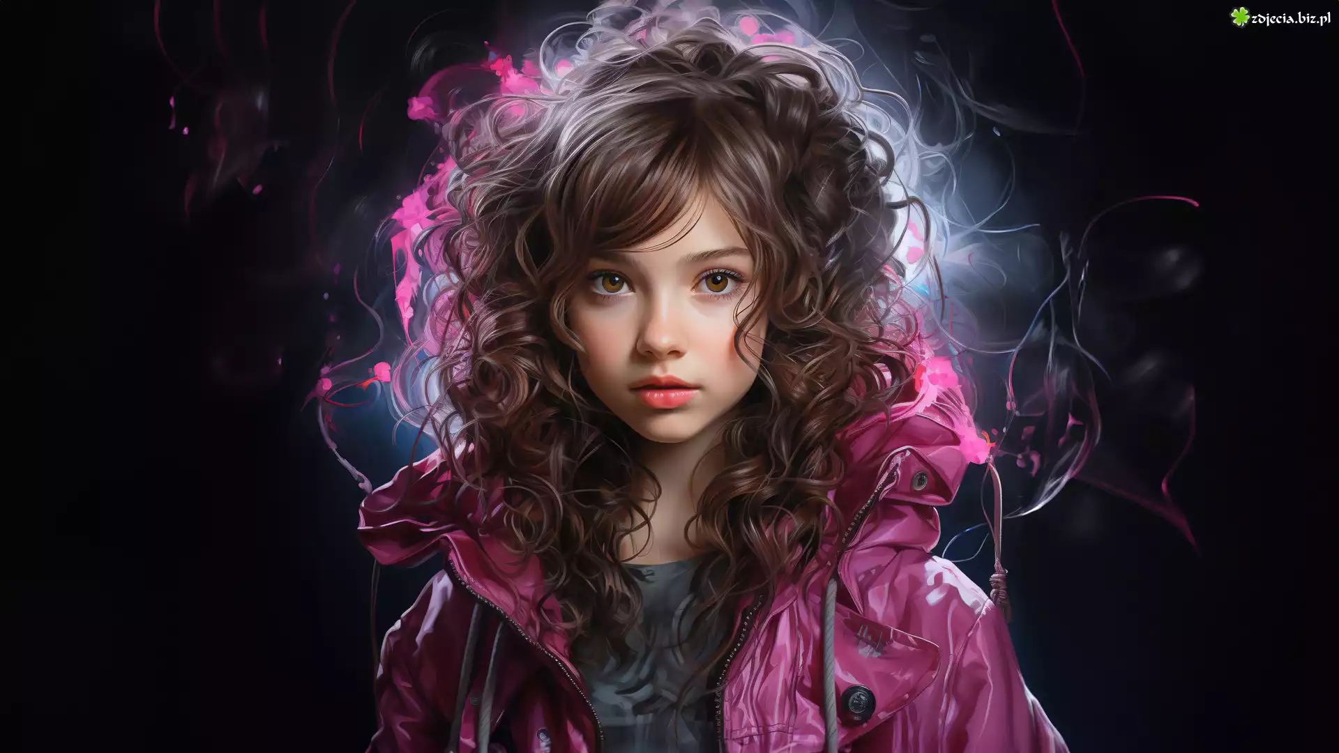 Zdjęcie Dziewczynka, Długie, Kręcone, Włosy, Fioletowa, Kurtka, Ciemne, Tło, Grafika