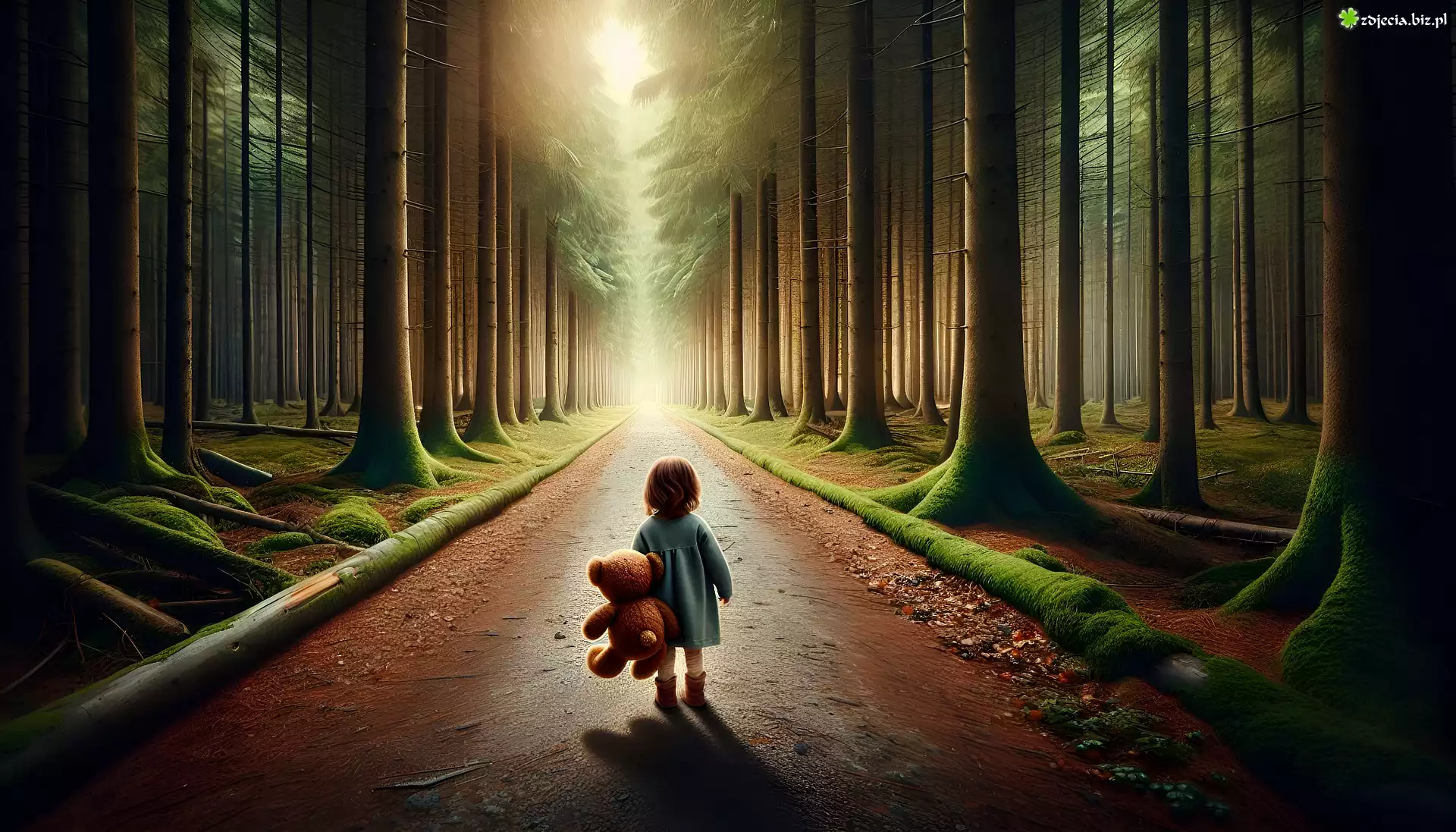 Zdjęcie Las, Drzewa, Droga, Dziewczynka, Miś, Pluszak, Grafika