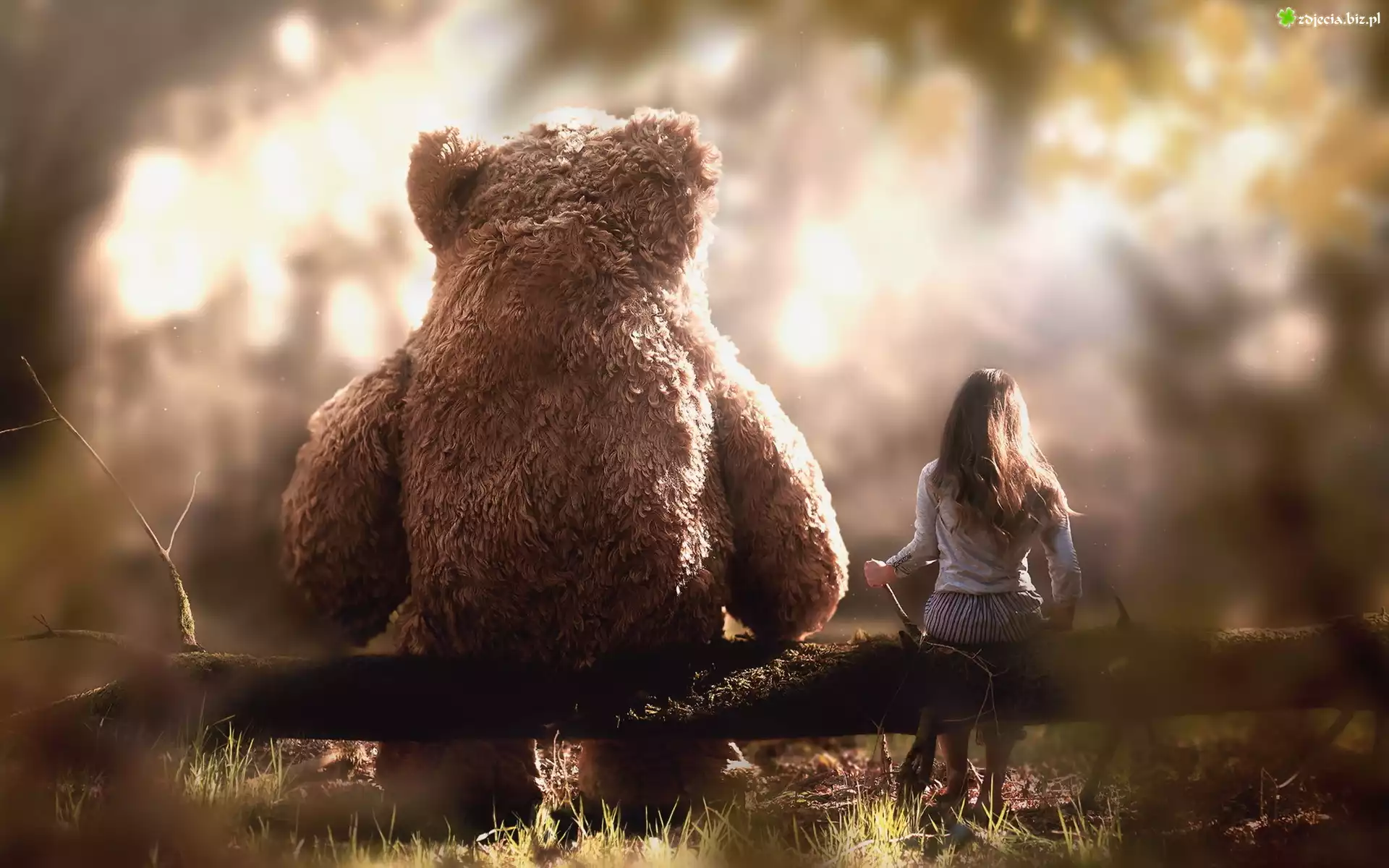 Zdjęcie Dziewczynka, Miś, Konar, Drzewa