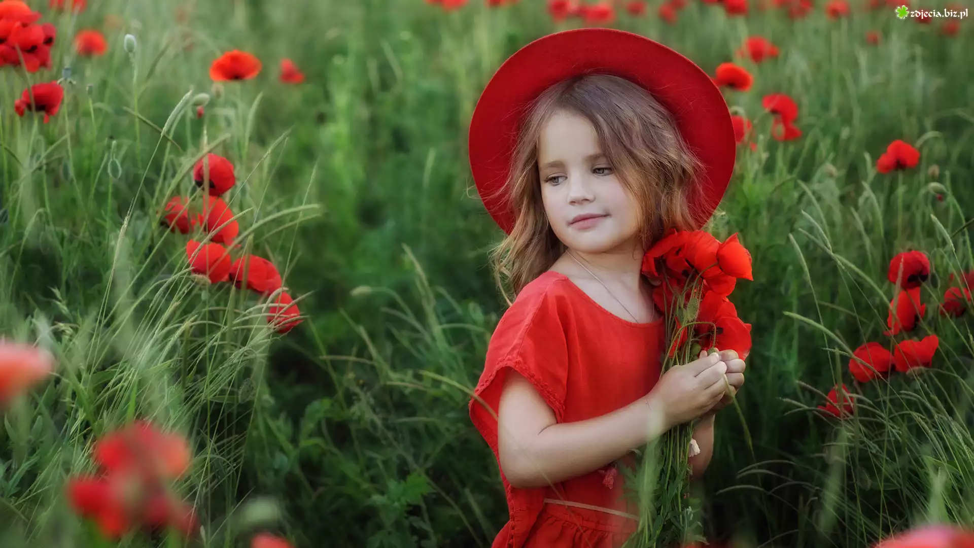 Zdjęcie Dziewczynka, Czerwony, Kapelusz, Kwiaty, Maki, Trawa