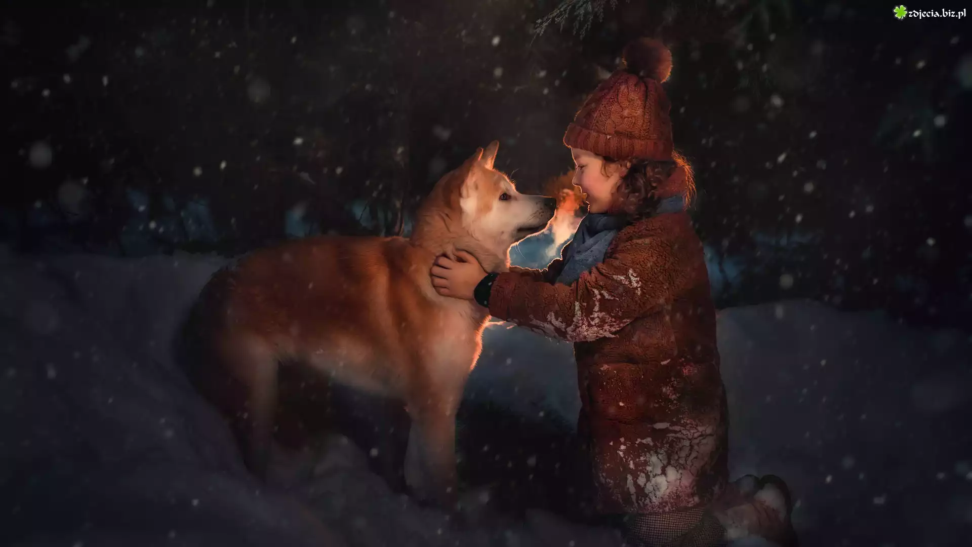 Zdjęcie Dziewczynka, Pies, Akita inu, Śnieg, Zima