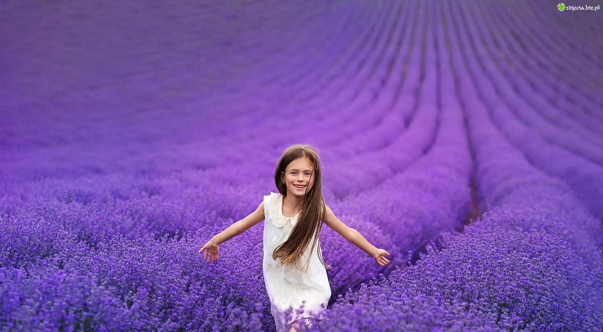 Zdjęcie Dziewczynka, Biała, Sukienka, Pole, Lawenda