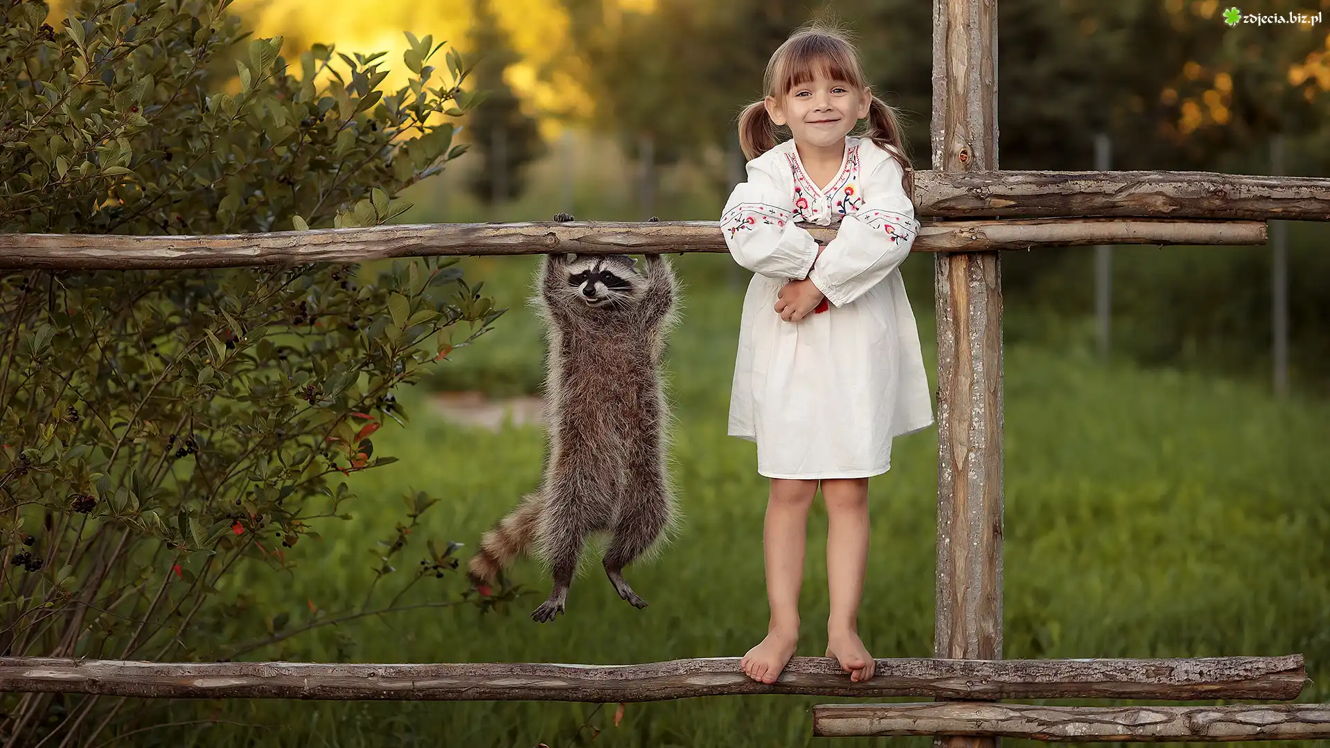 Zdjęcie Dziewczynka, Biała, Sukienka, Szop pracz, Płotek