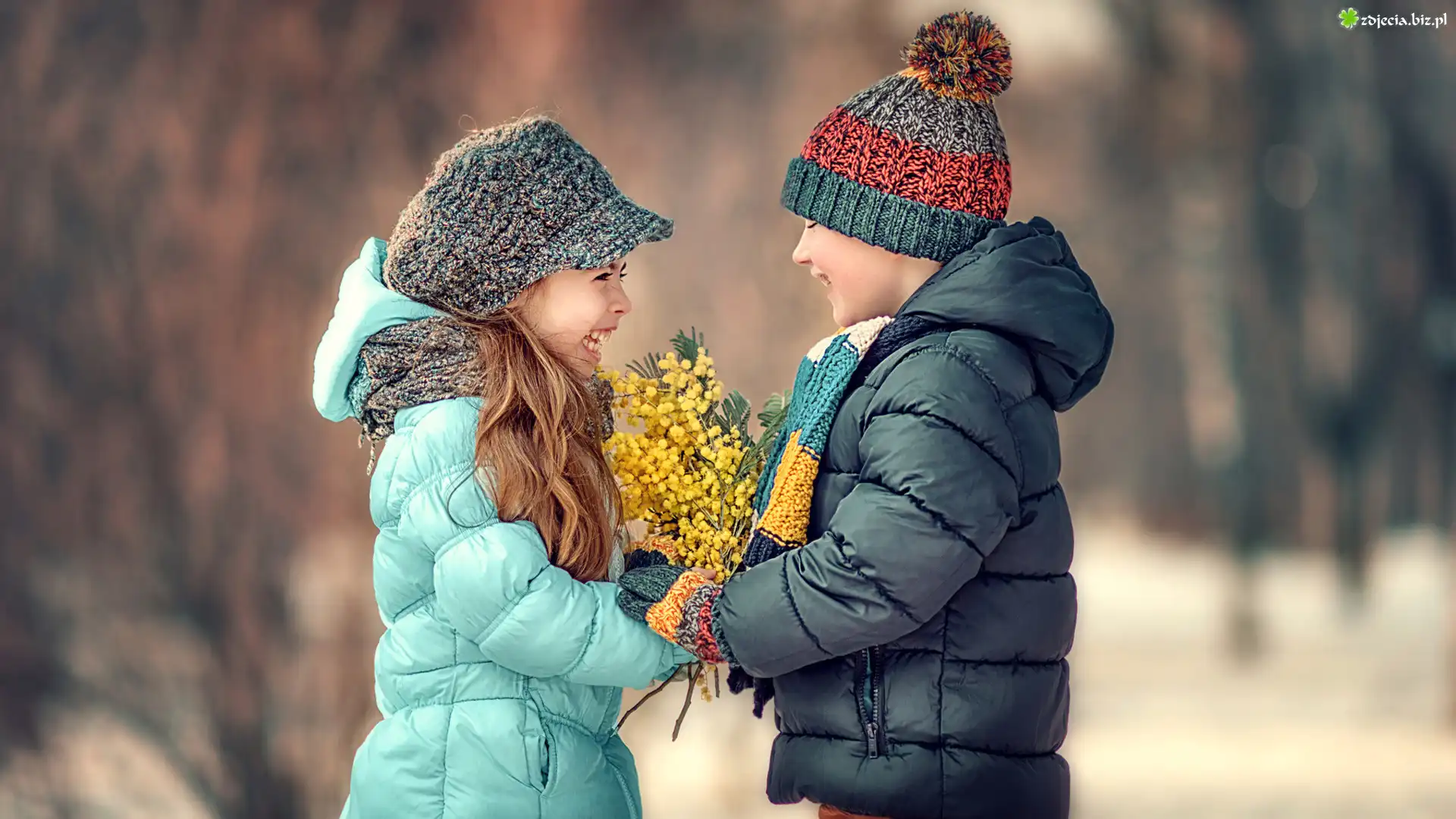 Zdjęcie Dziewczynka, Chłopak, Kwiaty, Akacja srebrzysta, Uśmiechy
