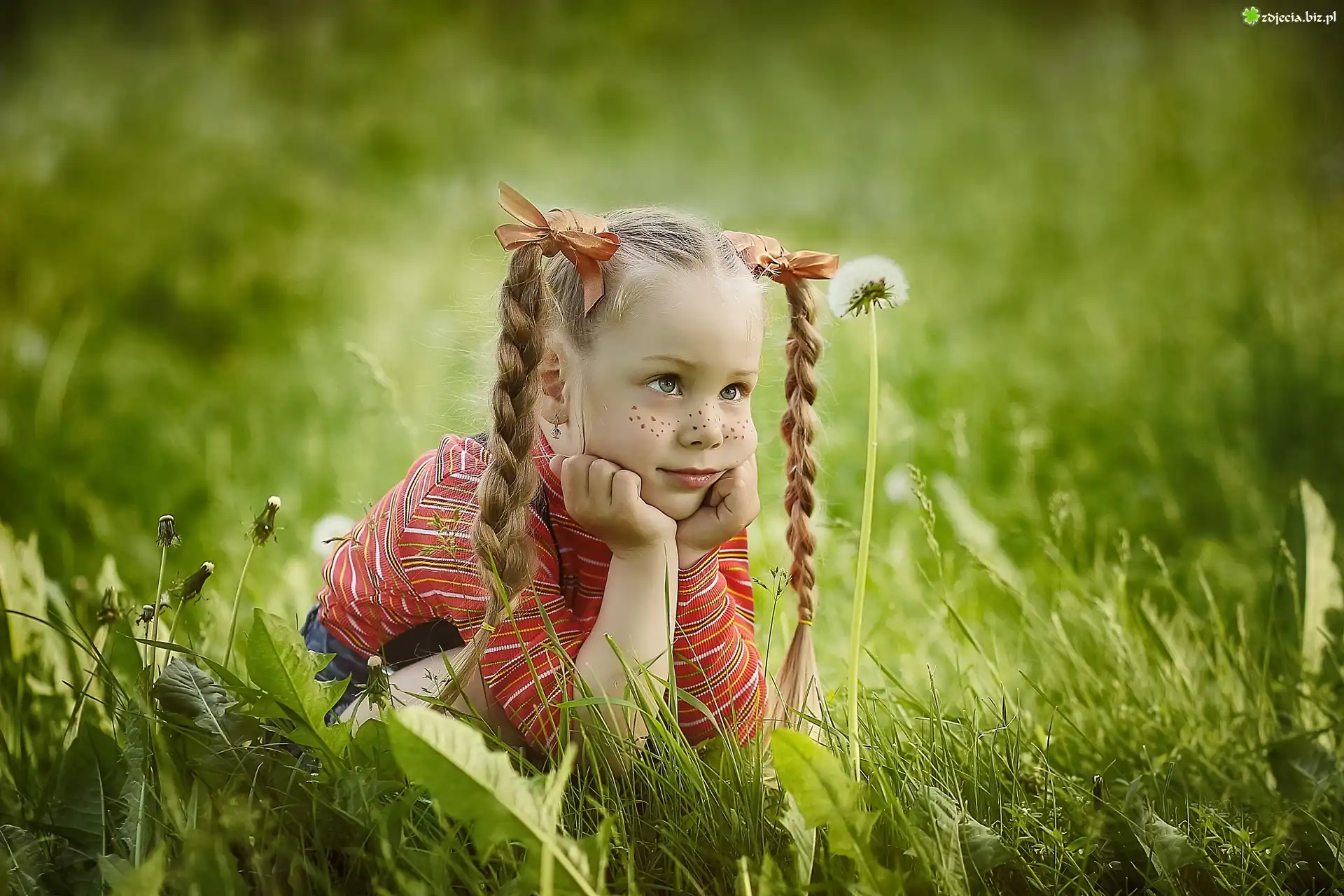 Zdjęcie, Dziewczynka, Piegi, Warkocze, Trawa