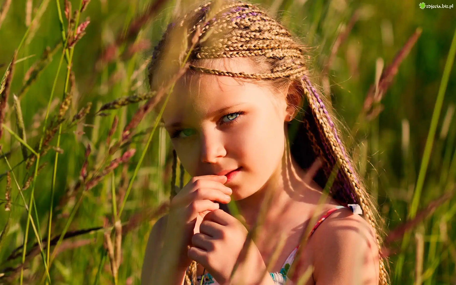 Zdjęcie Dziewczynka, Twarz, Warkoczyki, Trawa