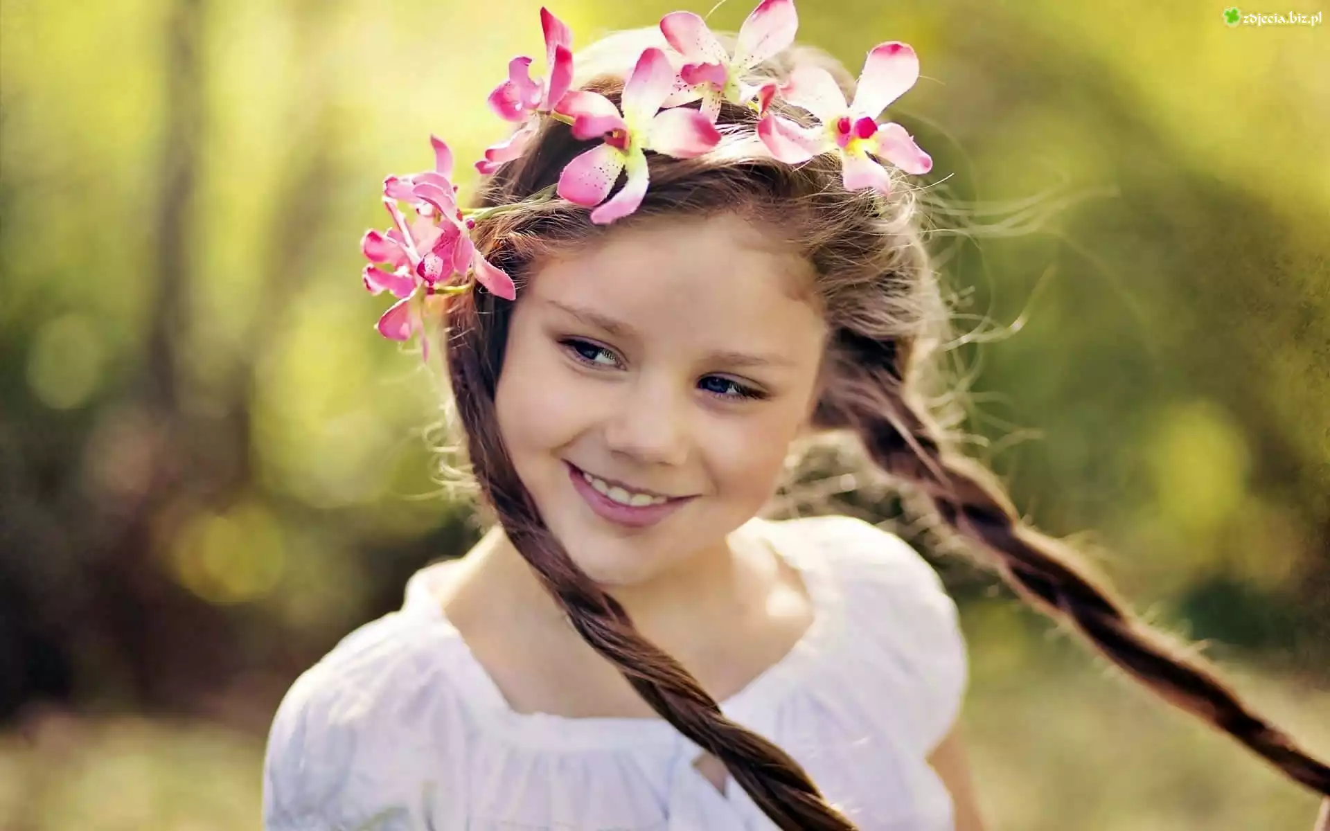 Zdjęcie Dziewczynka, Uśmiech, Warkocze, Wianek, Rozmycie