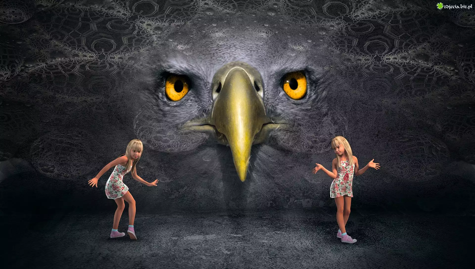 Zdjęcie Bliźnięta, Dziewczynki, Ptak, Dziób, Żółte, Oczy, Grafika