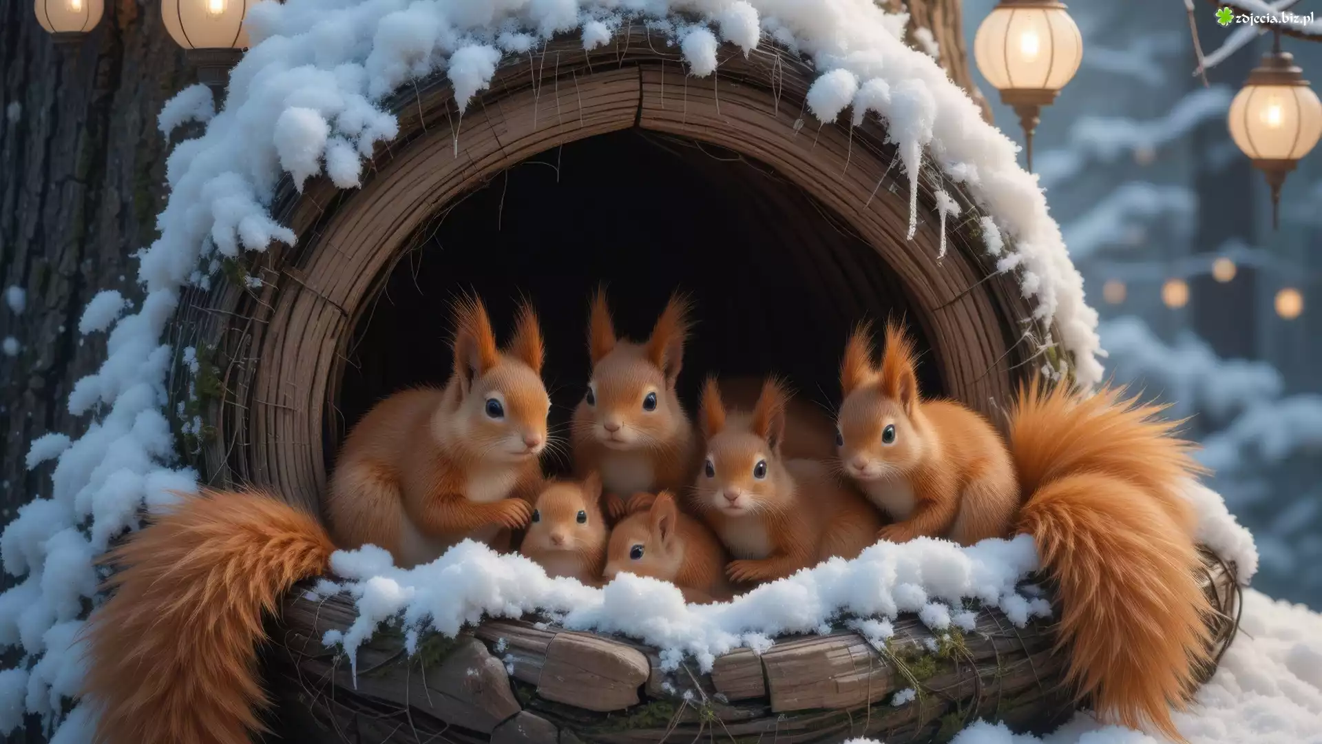 Zdjęcie Wiewiórki, Dziupla, Śnieg, Zima, Lampiony