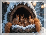 Zdjęcie, Wiewiórki, Dziupla, Śnieg, Zima, Lampiony
